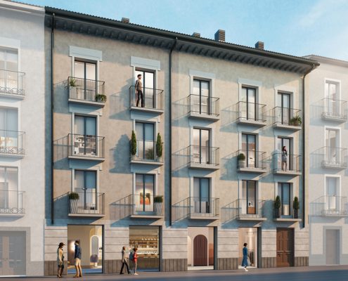 ATELIER HOMES Inmobiliaria+Arquitectura presenta Residencial Sierra de Orba en la confluencia de Calle Echegaray con la Calle Zocotín en pleno centro histórico y comercial de Jaca, a escasos metros del Ayuntamiento y de la Catedral.