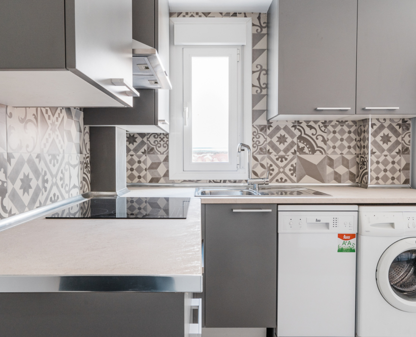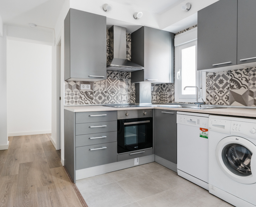Reforma integral de antigua vivienda de portería ubicada en Camino de Las Torres con Tenor Fleta. Se reformó completamente para rentabilizar su inversión en alquiler. Se trata de un inmueble de 45 m2 distribuido en 2 dormitorios, salón + cocina americana y baño.