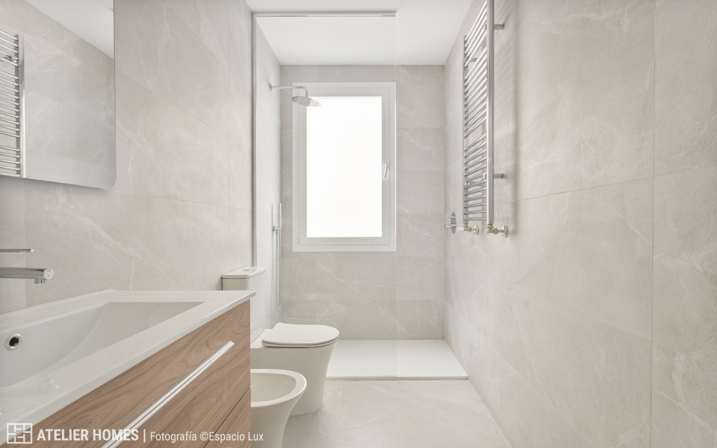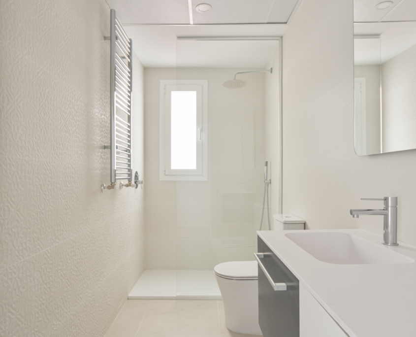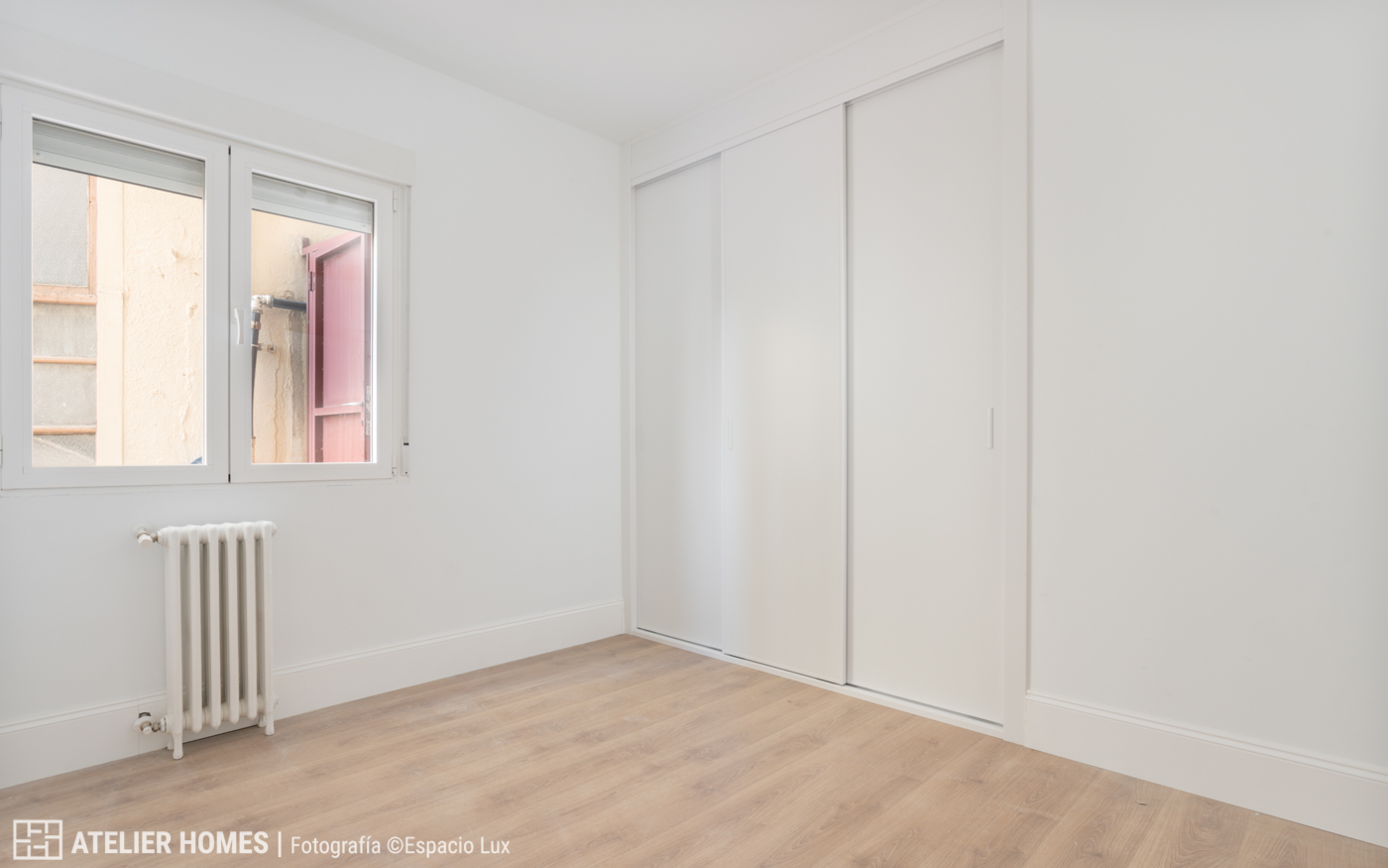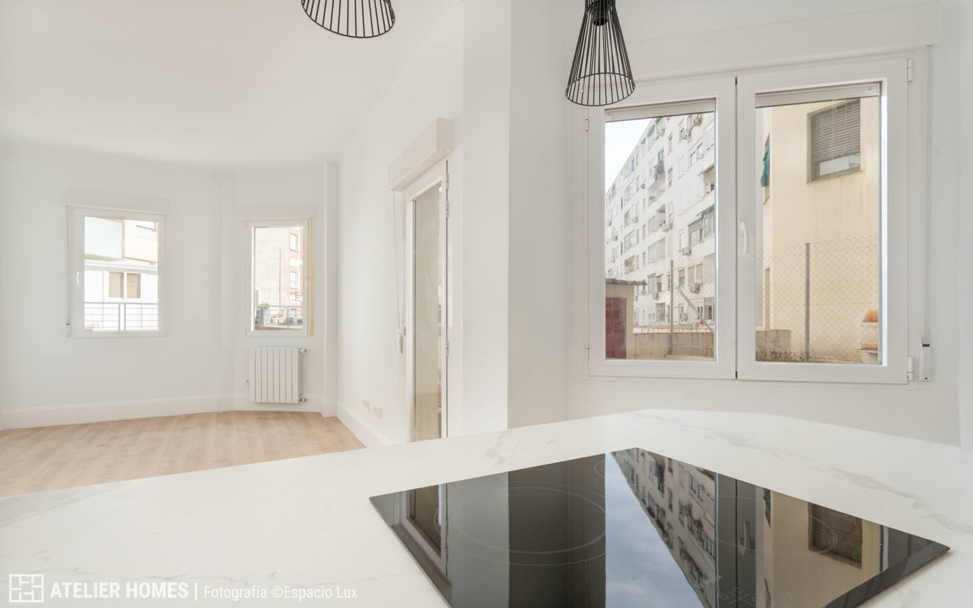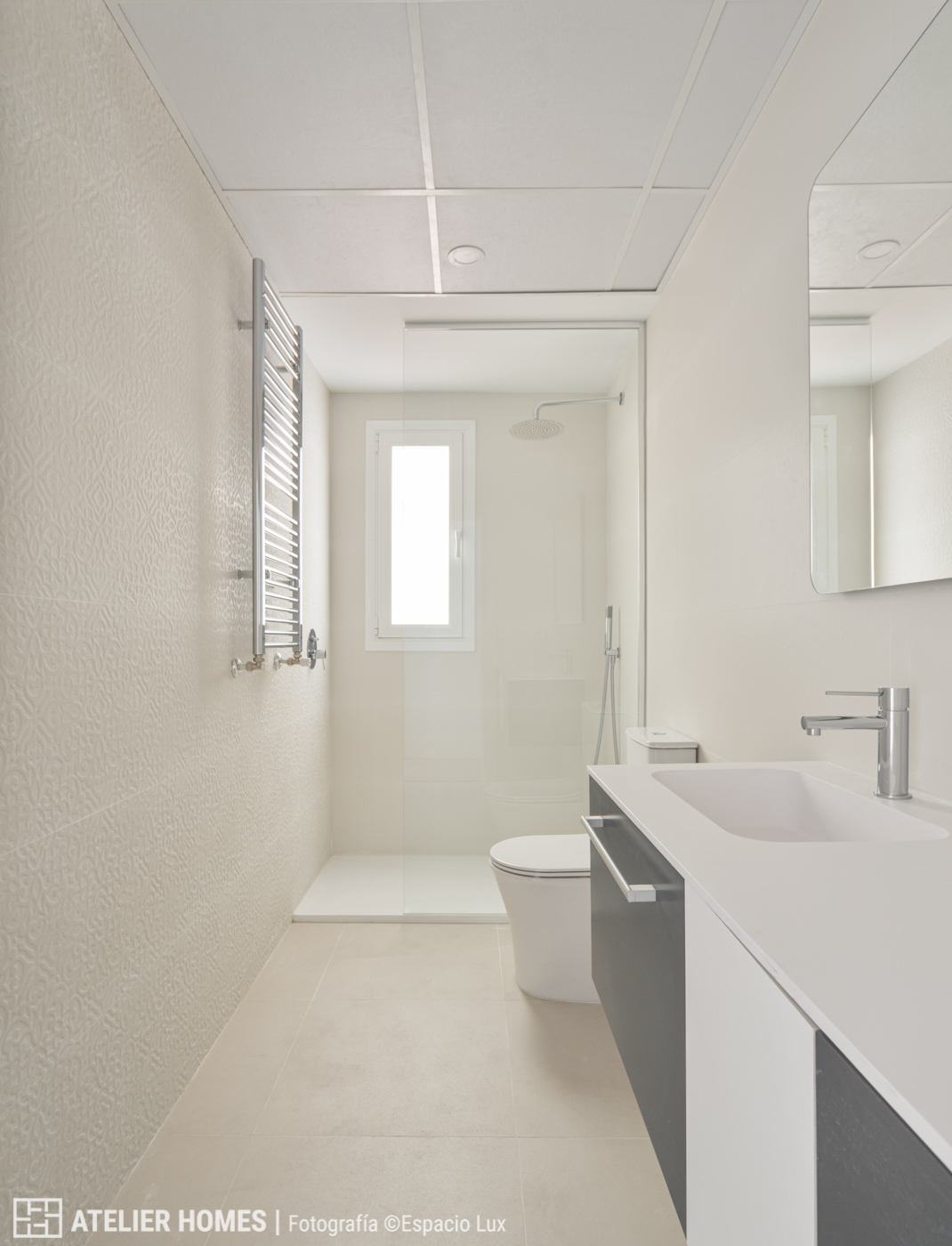 Reforma integral de vivienda de diseño Neoclásico con techo de 3 Metros de alto . Distribuida con un amplio Hall, salón - comedor, con cocina con isla en un mismo espacio, incluye dos habitaciones grandes con armarios empotrados y vestidos con puertas lacadas en blanco, realizados a medida. La vivienda es de un edificio protegido en una de las calles principales de Zaragoza con ventanales en todo su perímetro. Las ventanas son de alta gama con rotura puente térmico, doble cristal bajo emisivo y cámara de aire de 18 mm. Tarima flotante AC5 de gran tamaño y rodapiés de diseño de 20 cm de alto, lacados blancos en la vivienda y negros en el Hall de entrada. Los baños son de estilo Contemporáneo, con tonos grises y madera. La cocina es tipo americana con isla de diseño moderno, tonos beige cachemir, detalles en negro y dorado, con encimera porcelanica tipo mármol calacatta oro. Las puertas están enmarcadas con tiradores en negro, continuando con el estilo Neoclásico , se han colocado tanto en las habitaciones como en el salón diferentes paños con cuarterones y en la zona del techo las molduras de estilo clásico.