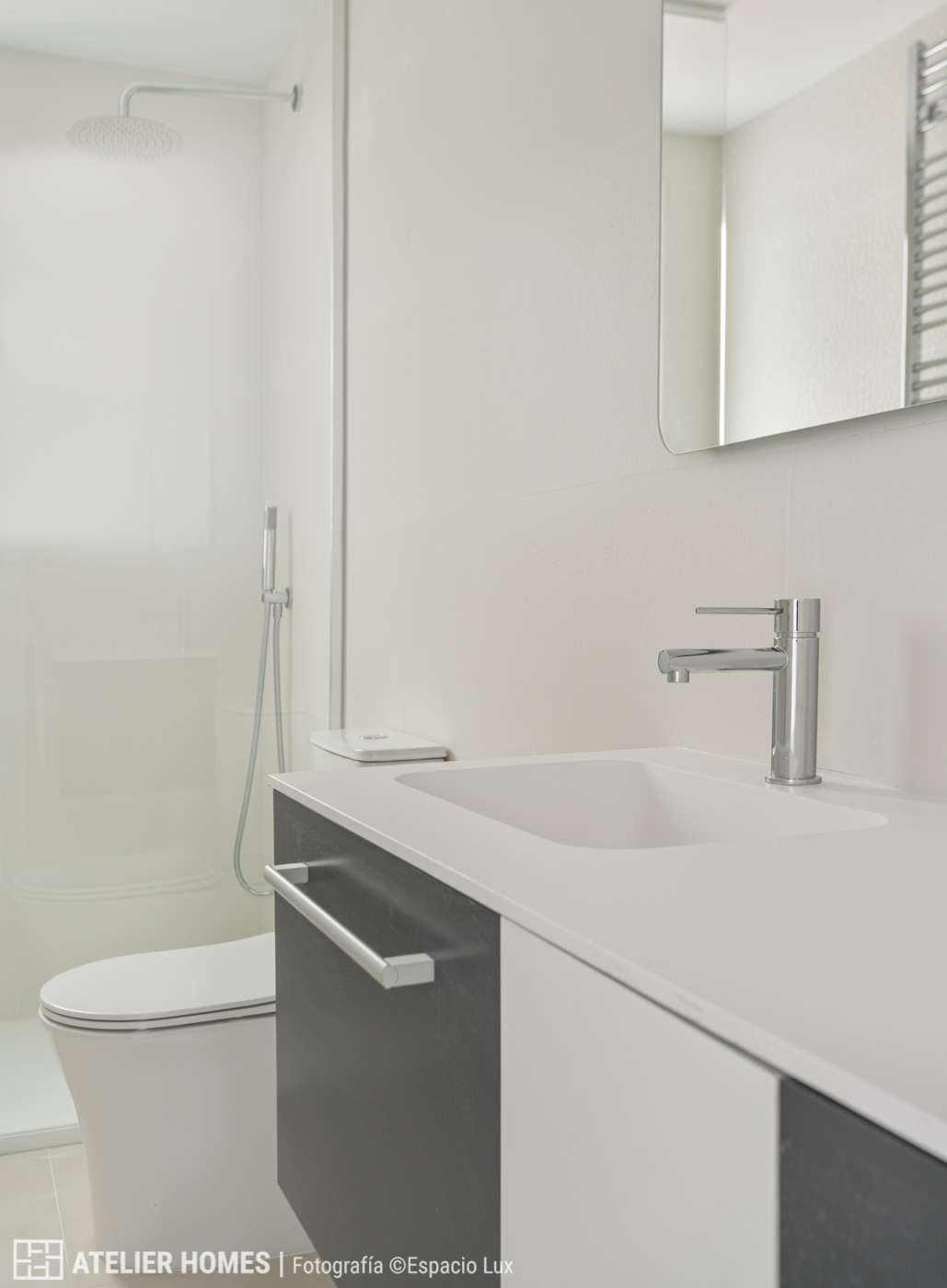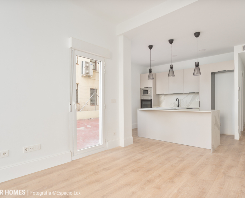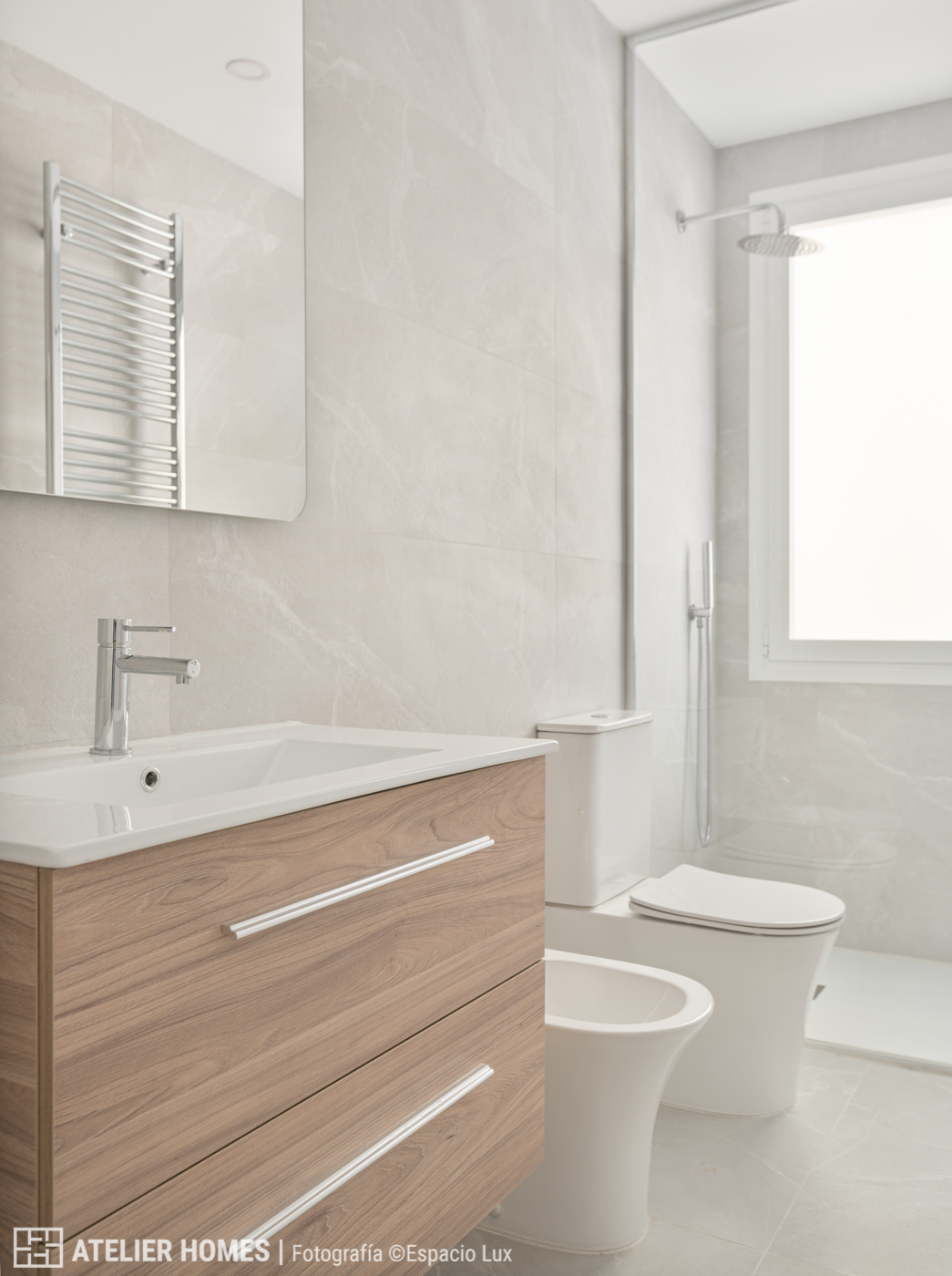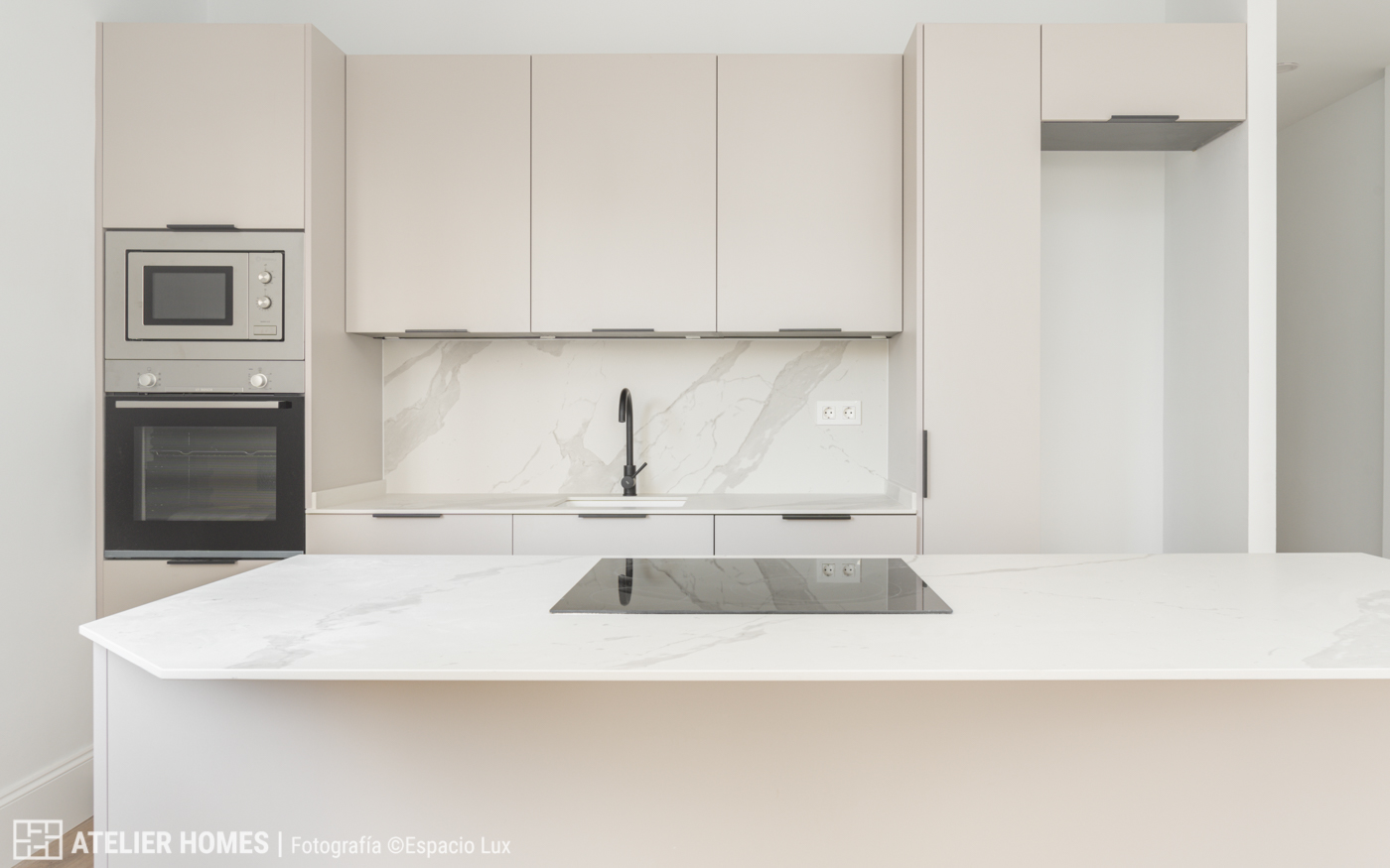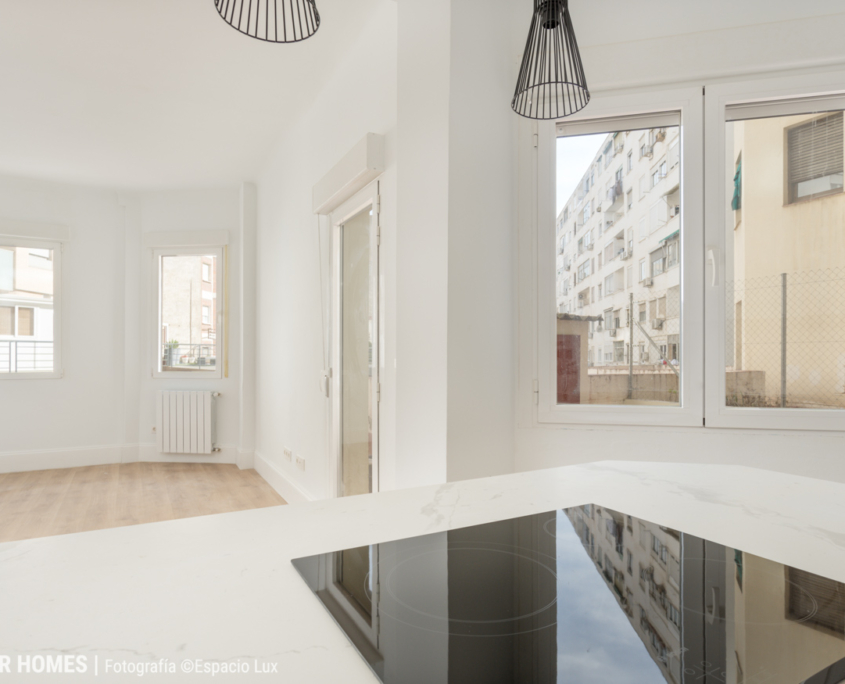 Reforma integral de vivienda de diseño Neoclásico con techo de 3 Metros de alto . Distribuida con un amplio Hall, salón - comedor, con cocina con isla en un mismo espacio, incluye dos habitaciones grandes con armarios empotrados y vestidos con puertas lacadas en blanco, realizados a medida. La vivienda es de un edificio protegido en una de las calles principales de Zaragoza con ventanales en todo su perímetro. Las ventanas son de alta gama con rotura puente térmico, doble cristal bajo emisivo y cámara de aire de 18 mm. Tarima flotante AC5 de gran tamaño y rodapiés de diseño de 20 cm de alto, lacados blancos en la vivienda y negros en el Hall de entrada. Los baños son de estilo Contemporáneo, con tonos grises y madera. La cocina es tipo americana con isla de diseño moderno, tonos beige cachemir, detalles en negro y dorado, con encimera porcelanica tipo mármol calacatta oro. Las puertas están enmarcadas con tiradores en negro, continuando con el estilo Neoclásico , se han colocado tanto en las habitaciones como en el salón diferentes paños con cuarterones y en la zona del techo las molduras de estilo clásico.