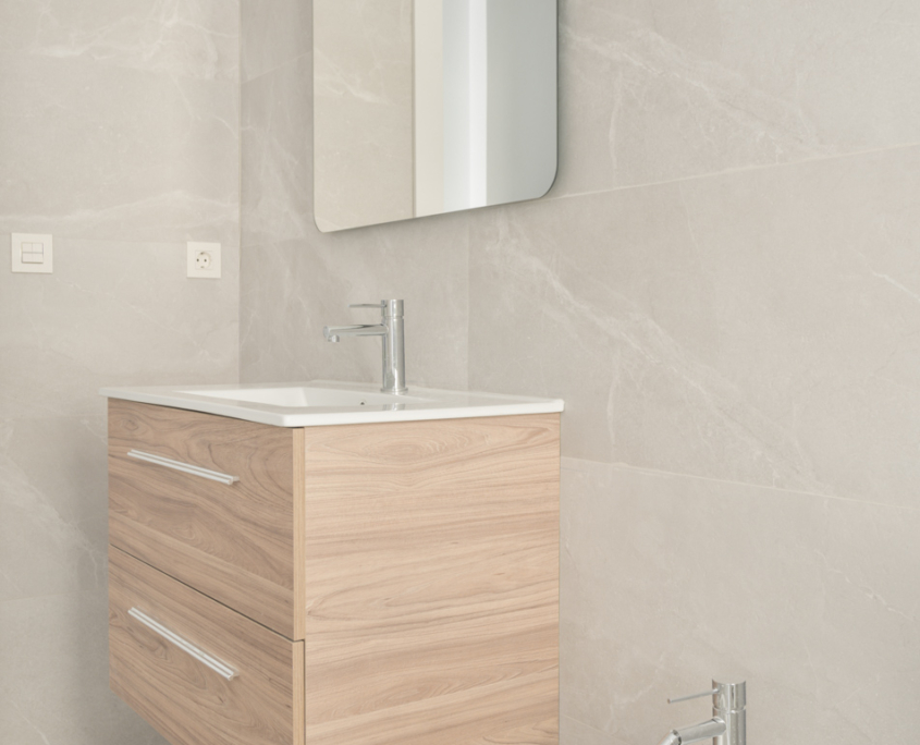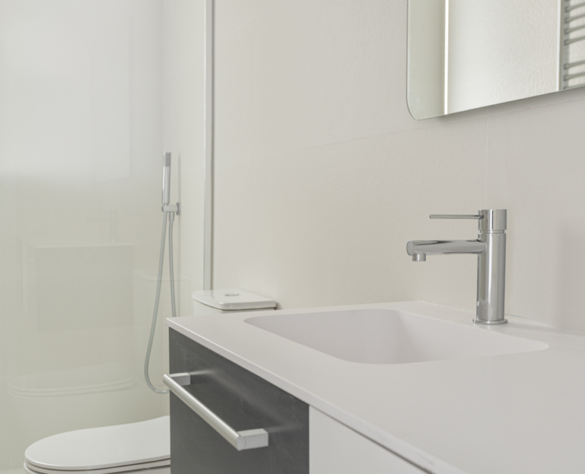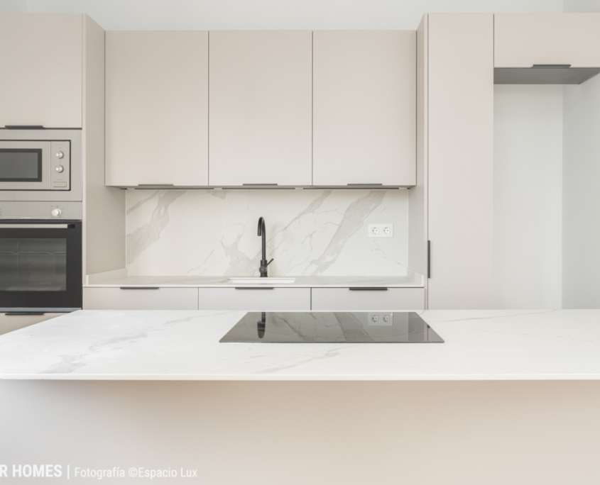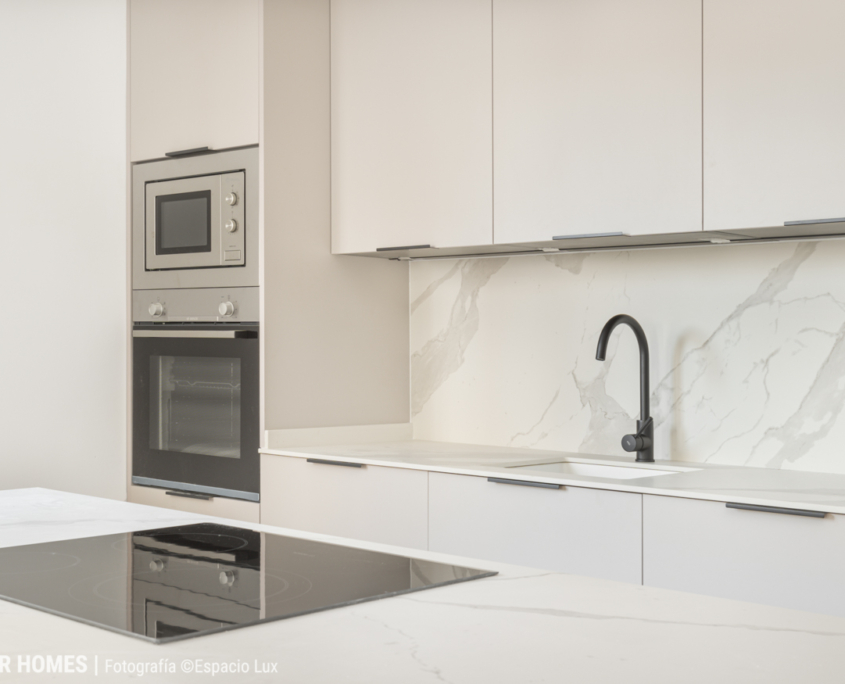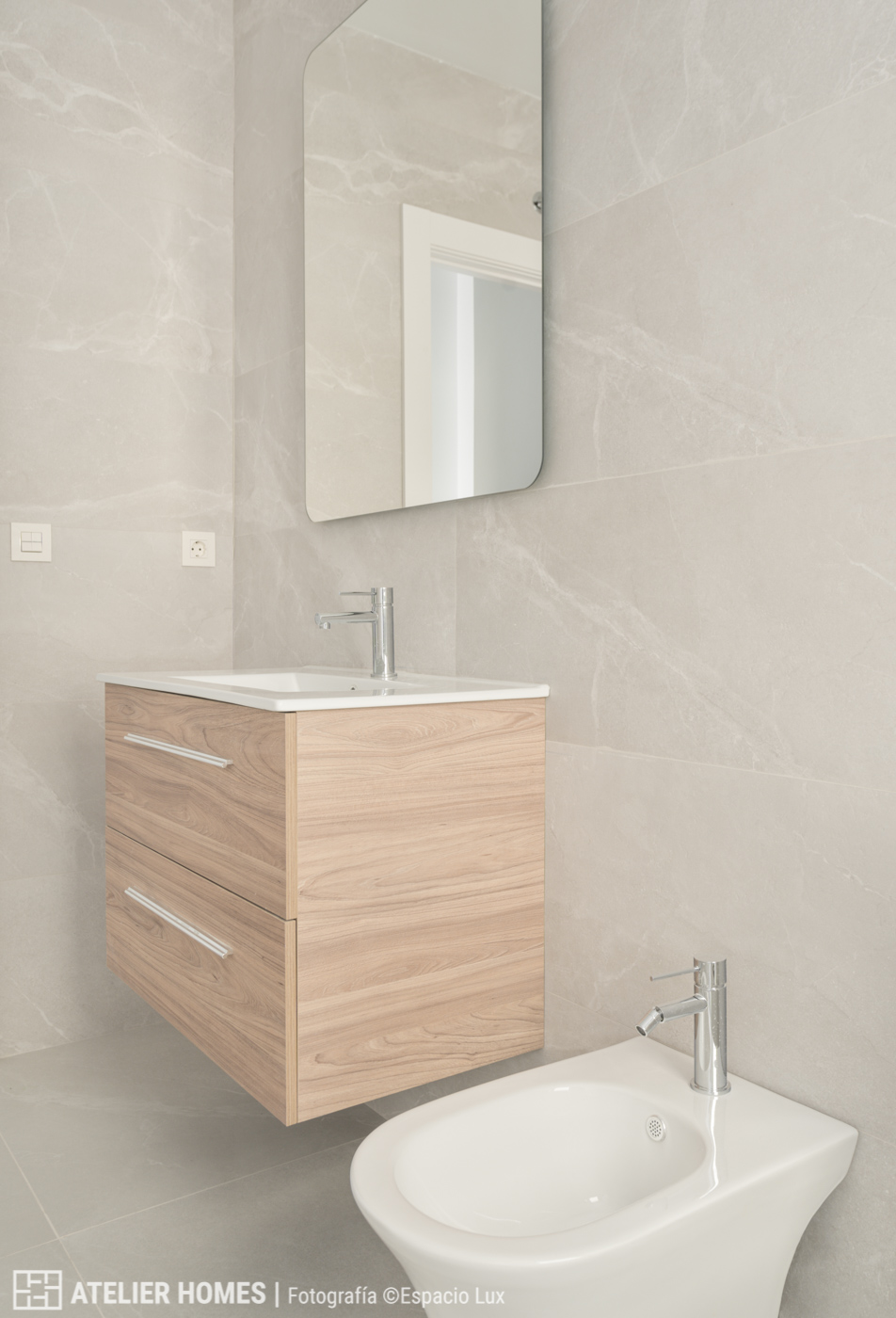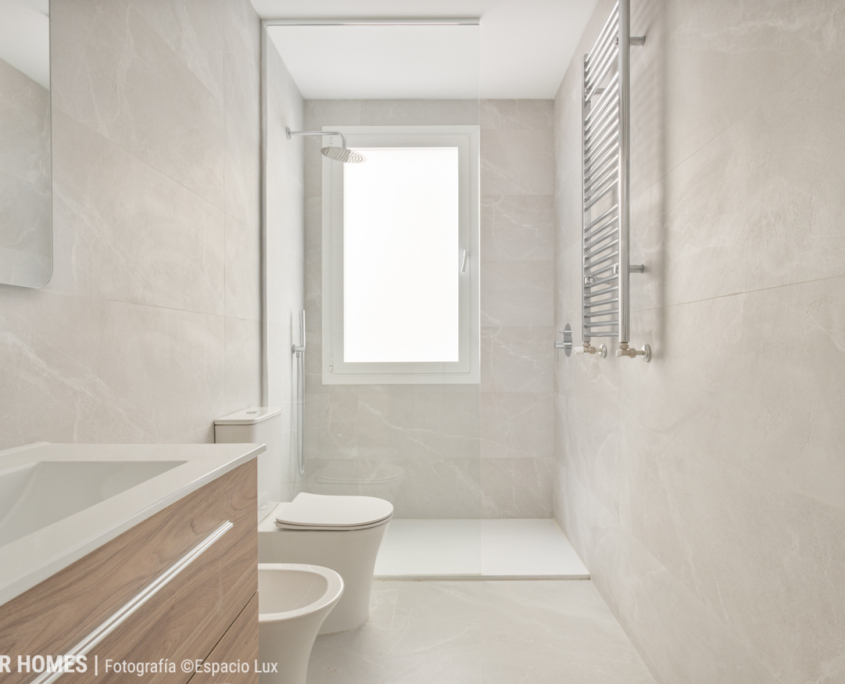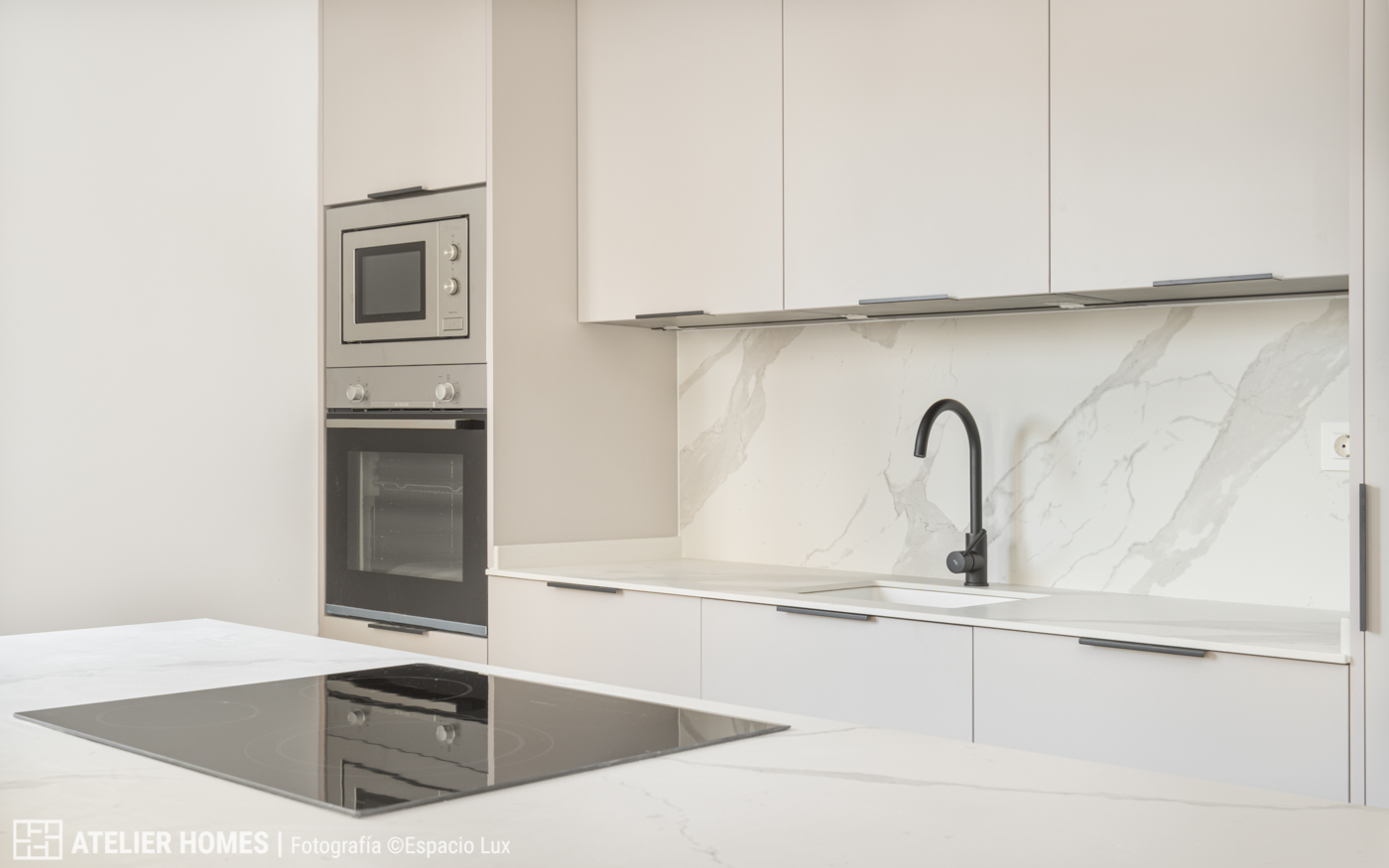 Reforma integral de vivienda de diseño Neoclásico con techo de 3 Metros de alto . Distribuida con un amplio Hall, salón - comedor, con cocina con isla en un mismo espacio, incluye dos habitaciones grandes con armarios empotrados y vestidos con puertas lacadas en blanco, realizados a medida. La vivienda es de un edificio protegido en una de las calles principales de Zaragoza con ventanales en todo su perímetro. Las ventanas son de alta gama con rotura puente térmico, doble cristal bajo emisivo y cámara de aire de 18 mm. Tarima flotante AC5 de gran tamaño y rodapiés de diseño de 20 cm de alto, lacados blancos en la vivienda y negros en el Hall de entrada. Los baños son de estilo Contemporáneo, con tonos grises y madera. La cocina es tipo americana con isla de diseño moderno, tonos beige cachemir, detalles en negro y dorado, con encimera porcelanica tipo mármol calacatta oro. Las puertas están enmarcadas con tiradores en negro, continuando con el estilo Neoclásico , se han colocado tanto en las habitaciones como en el salón diferentes paños con cuarterones y en la zona del techo las molduras de estilo clásico.