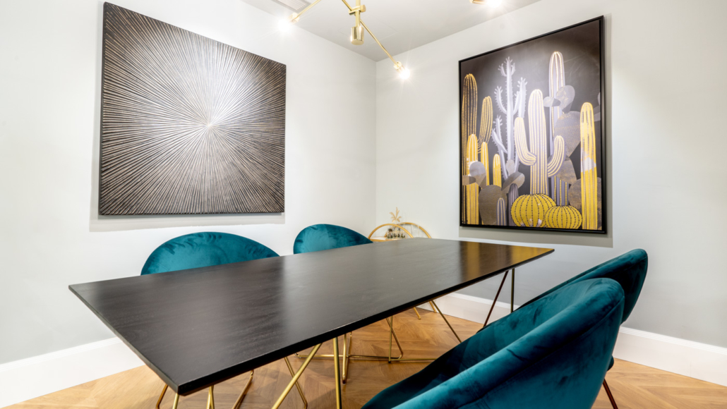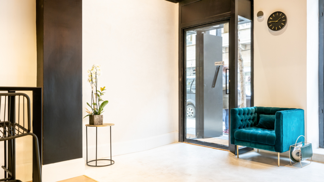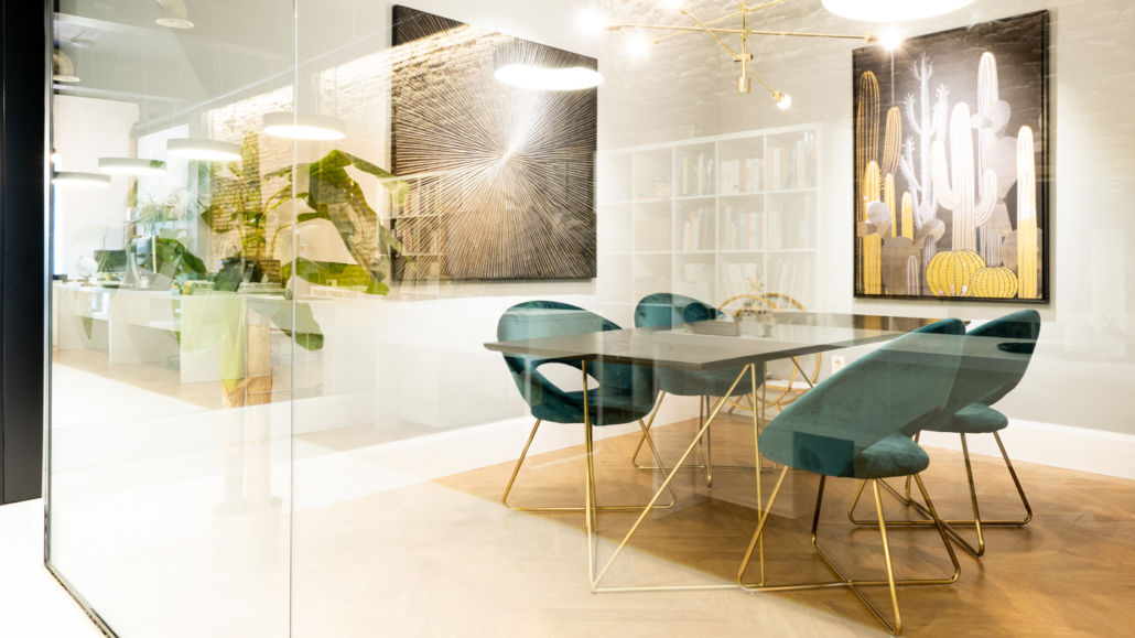La sala de reunión, techos y cristalería, se dejaron con perfilería negra de metal, dándole un concepto industrial inspirado en los locales londinenses y berlineses de finales de los años 80`s. Finalmente, descubrimos el ladrillo antiguo original de la fachada del edificio, el cual aprovechamos como decoración iluminándolo mediante tiras de led. Todo ello le aporta a la oficina una atmósfera relajada y desenfada, sin perder la elegancia característica de los locales del centro de la ciudad.
