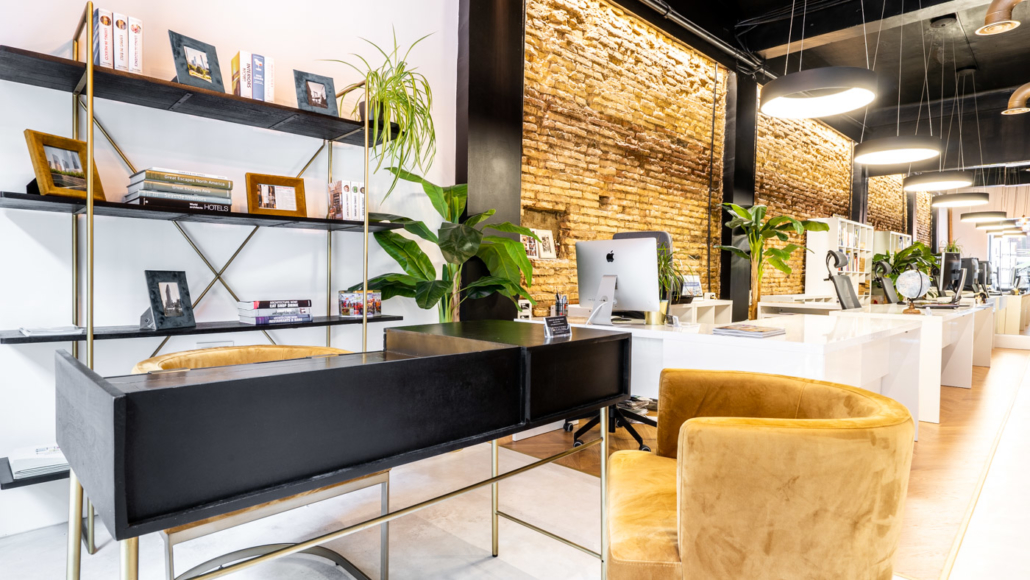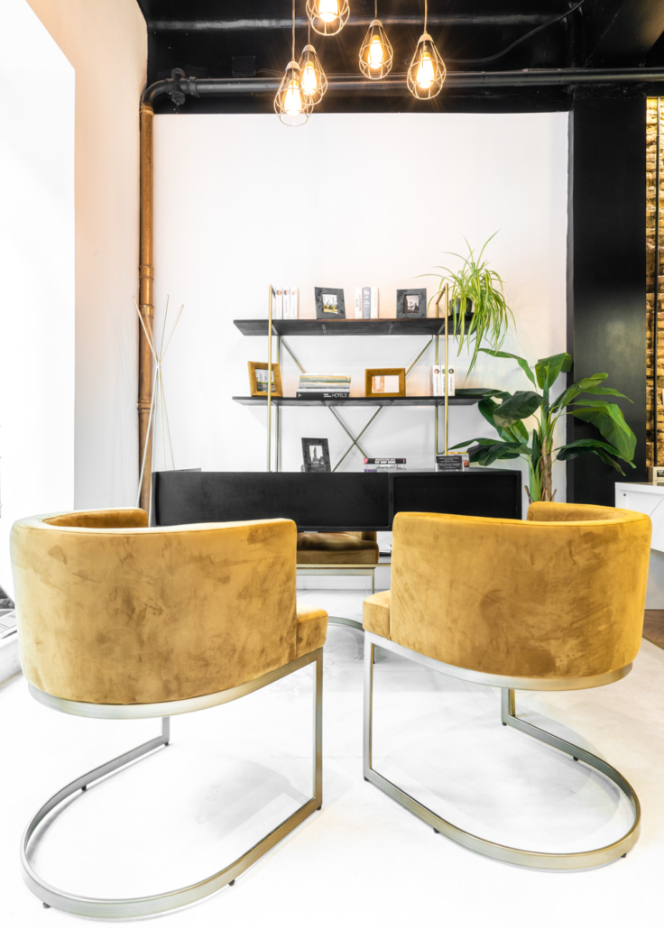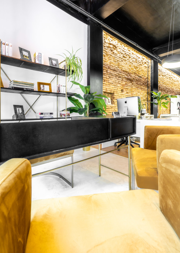 La oficina , de 80 m2 completamente rectangulares y en planta, había sido durante muchos años una tienda de Zaragoza de iluminación y se encontraba en un estado completamente a reformar. Se actuó sobre todo el espacio del local, creando un concepto industrial – vintage – chic , caracterizado por los juegos de la iluminación led, los materiales clásicos ( yeso de parís, tarima en espiga y ladrillo) y el mobiliario chic (dorados, terciopelo, madera negra…) Toda la climatización se llevó a cabo dejando los conductos por tubería lacada en dorado a la vista.